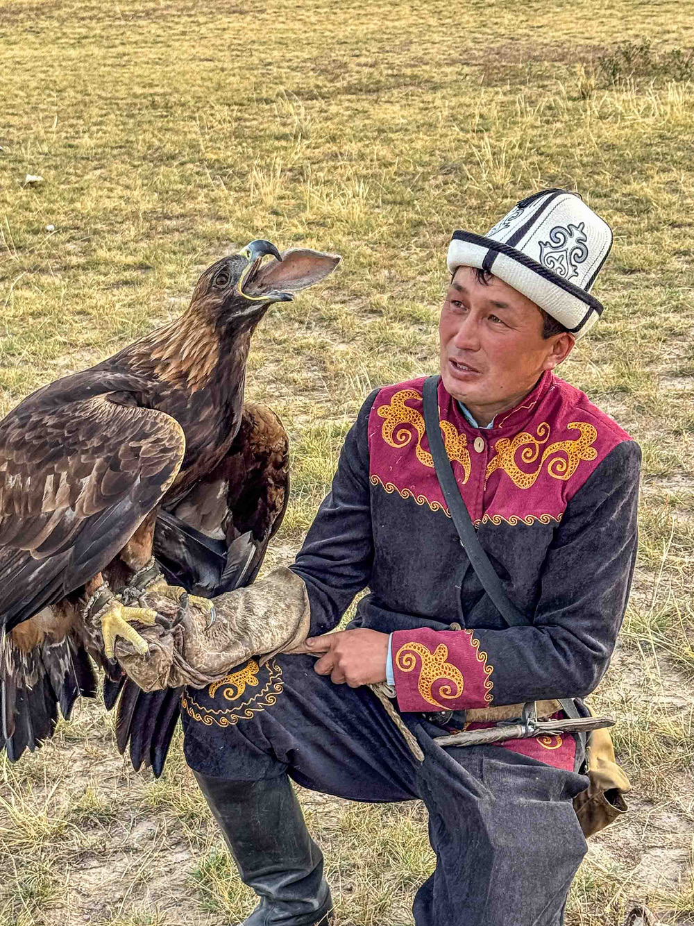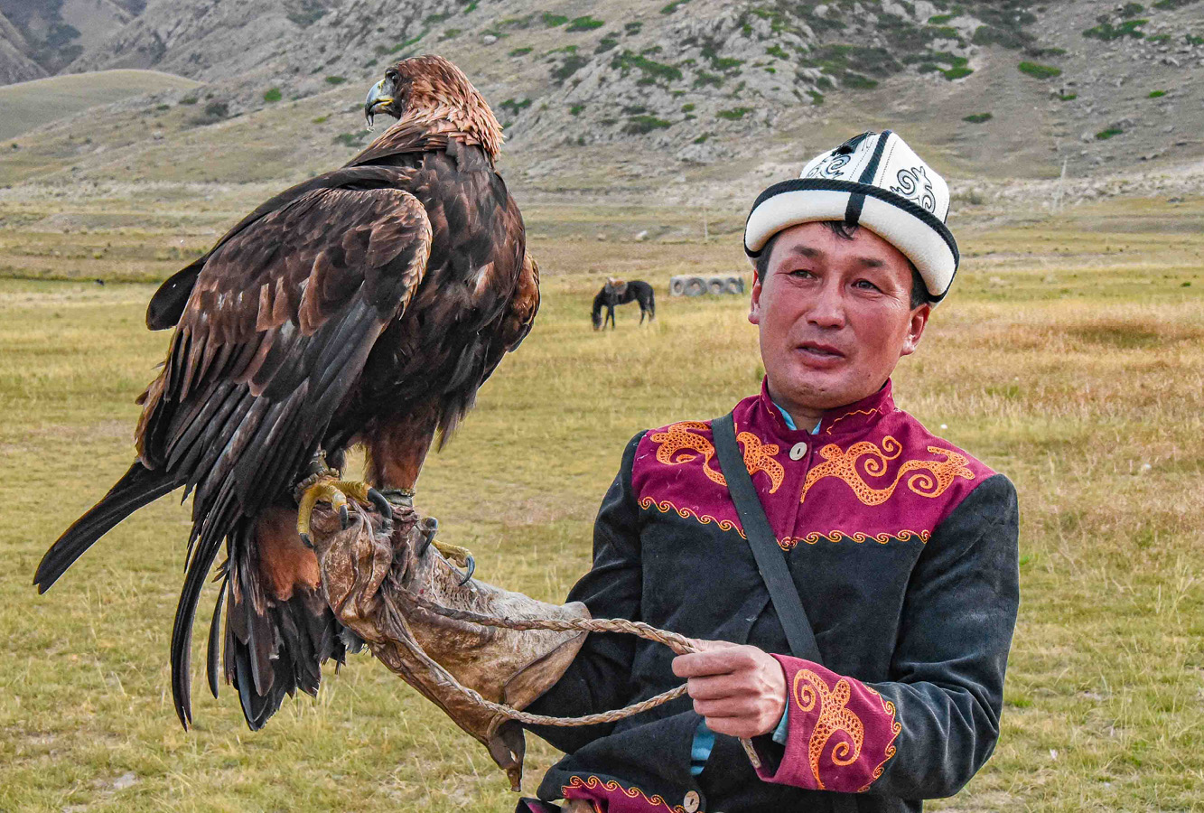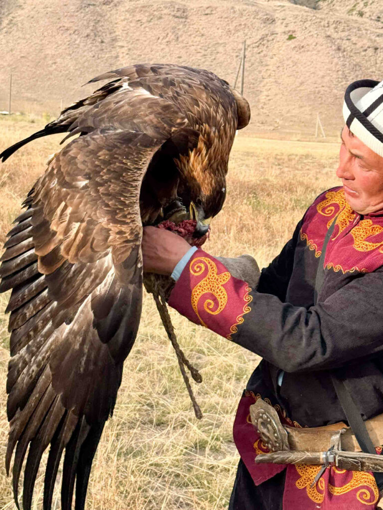 Nowadays, about forty to fifty master eagle hunters are left in Kyrgyzstan. They keep the custom alive as a proud symbol of their culture and pass on the skills and practice to willing sons and relatives. A significant source of income these days comes from staging performances for tourists like us. This practice presents a dilemma in formerly nomadic communities, whose members see their revered cultural customs served up as entertainment. On the other hand, the performances can generate a nice income to supplement earnings from their small family farms.